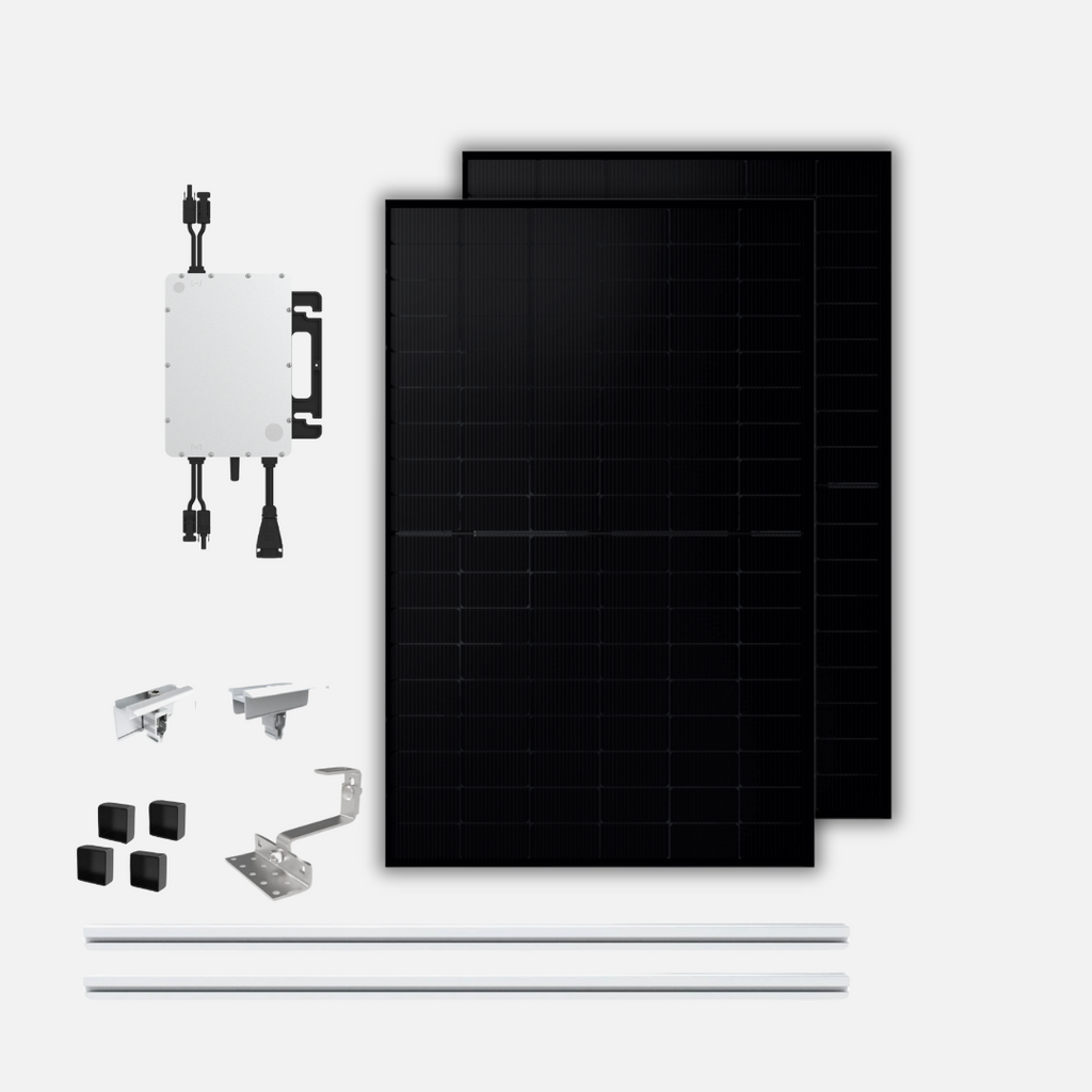 • 2 bifaziale Solarmodule mit je 440 W Leistung (gesamt 880 W) in moderner Full Black-Optik – dank bifazialer Technik wird auch Licht auf der Modulrückseite genutzt, was den Ertrag deutlich erhöht.